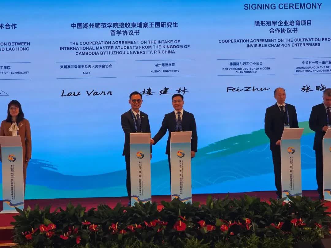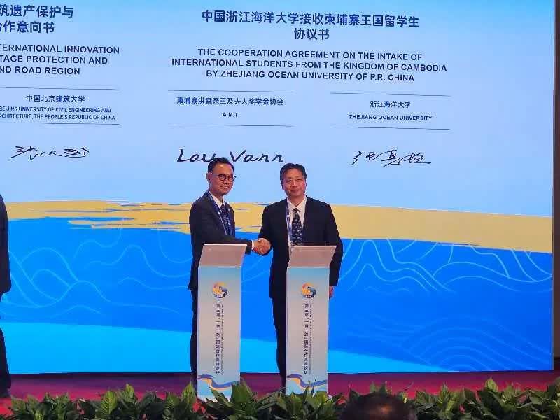 10月18日上午,柬埔寨洪森亲王与夫人奖学金协会(A.M.T)与湖州师范学院和浙江海洋大学在中国北京举行备忘录签约仪式。通过本次签约仪式,上述两校将为洪森亲王与夫人奖学金协会提供赴华留学深造的50个奖学金名额。