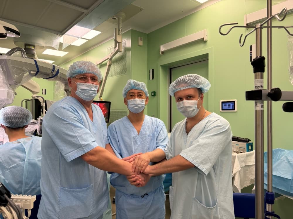 任晓平教授(中)与俄罗斯医疗团队成员握手。(任晓平教授专家团队供图)