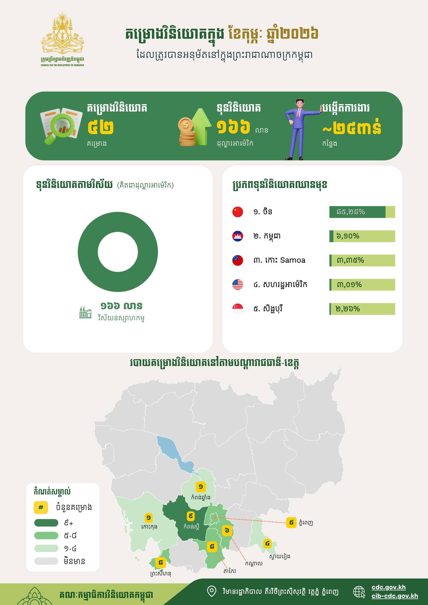 【柬埔寨头条综合报道】据柬媒消息,在今年2月的28天内,柬埔寨通过柬埔寨发展理事会(CDC)及各省市投资小组委员会共批准42个投资项目,投资总额约1.66亿美元。