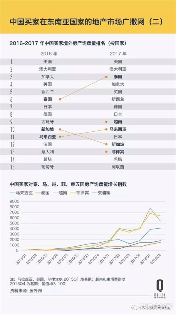 去年来自大陆、台湾和香港的买家占东南亚国家外国买家总交易量的 25%,高于 2016 年的 21%。如果按照询盘量统计,泰国 2017 年在最受中国买家欢迎的置业市场排行榜上的名次从第六上升至第三。同时,马来西亚的排名也上升了六位,目前位居第九名。
