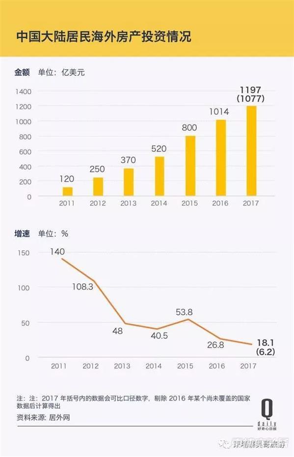 全球中文房产平台居外网汇编的数据显示,去年中国居民去年在海外置业上豪掷 1197 亿美元(可比口径 1077 亿美元),同比增长大约 18%(可比口径为 6.2%),其中住宅项目大约有 659 亿美元。