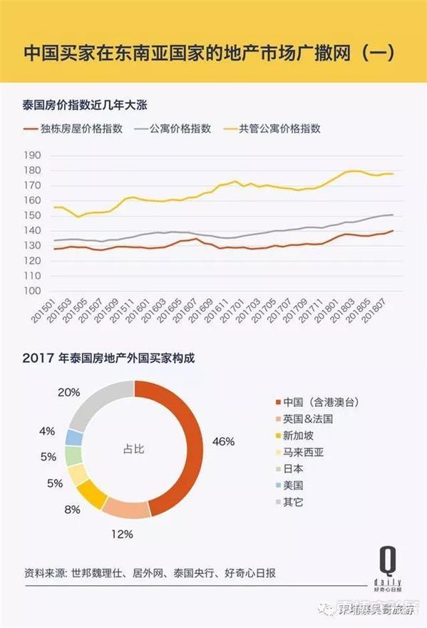 世邦魏理仕的统计结果则显示,2017 年中国占到在泰外国人买房的 46%,遥遥领先于排名第二的英法。泰国独栋房屋、共管公寓和城市普通公寓的房价指数近年来一直在上涨,截至今年 8 月末这些房价指数分别较 2015 年上涨 9%-14% 不等。