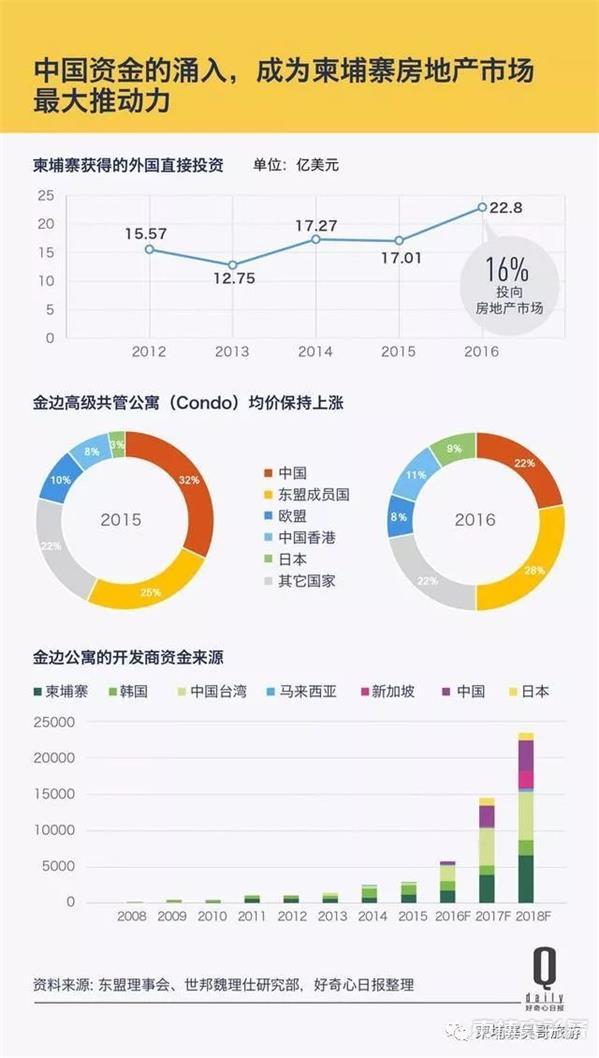 去年柬埔寨一共取得大约 27.32 亿美元外国直接投资(FDI),《好奇心日报(www.qdaily.com)》暂未能查询到依据国别和行业划分的外资流入数据。但根据东盟理事会的年度投资报告,2016 年这一数值约为 22.8 亿美元,其中 16% 的外国资本流入柬埔寨房地产市场。中国是当年柬埔寨最大的资本流入国/地区,占据柬埔寨 22% 的 FDI。中国香港紧随其后,占比约 11%。