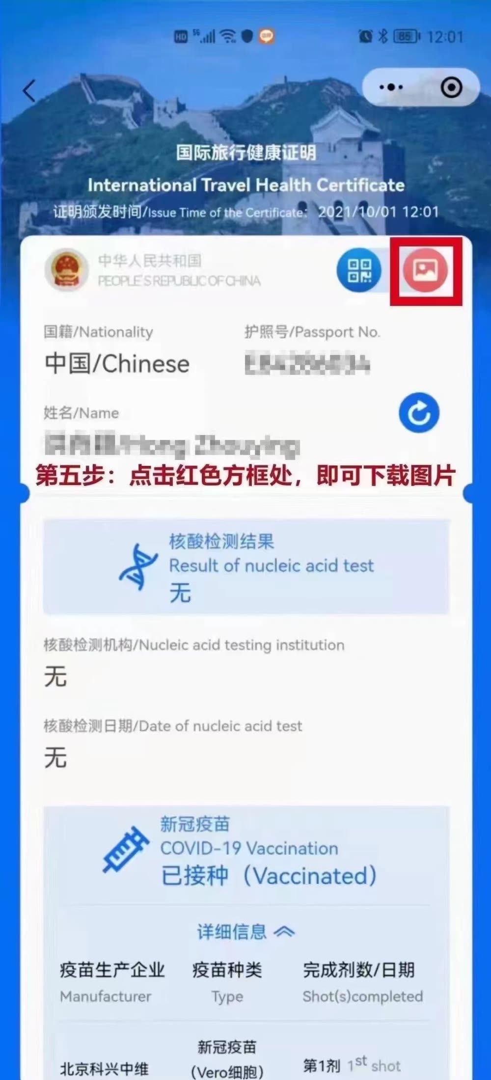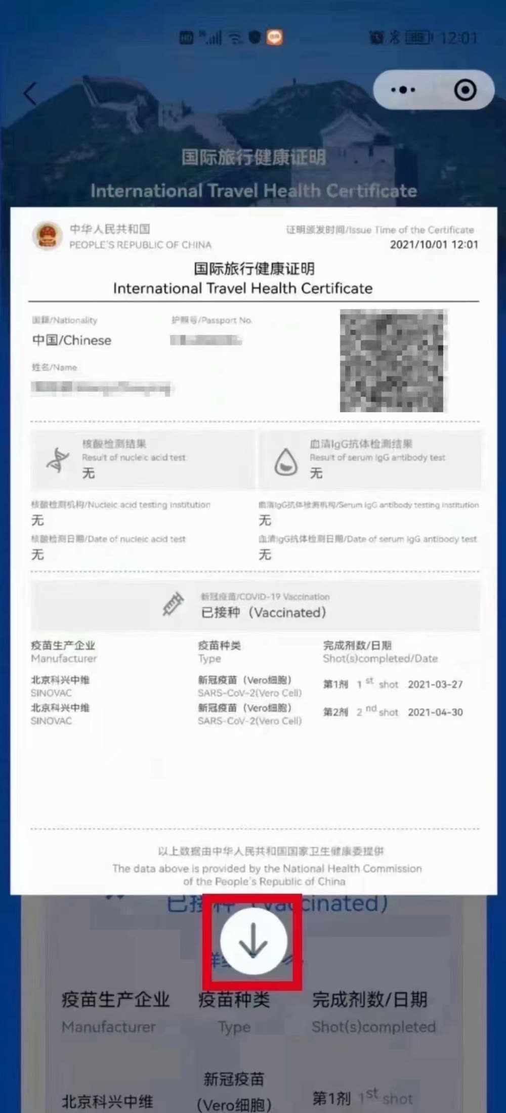 第五步:点击页面右上角“红色照片”图标。接下来直接跳出“国际旅行健康证明”,最后点击下载“↓”按钮,中英文版疫苗接种证明就生成了。