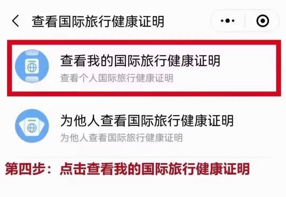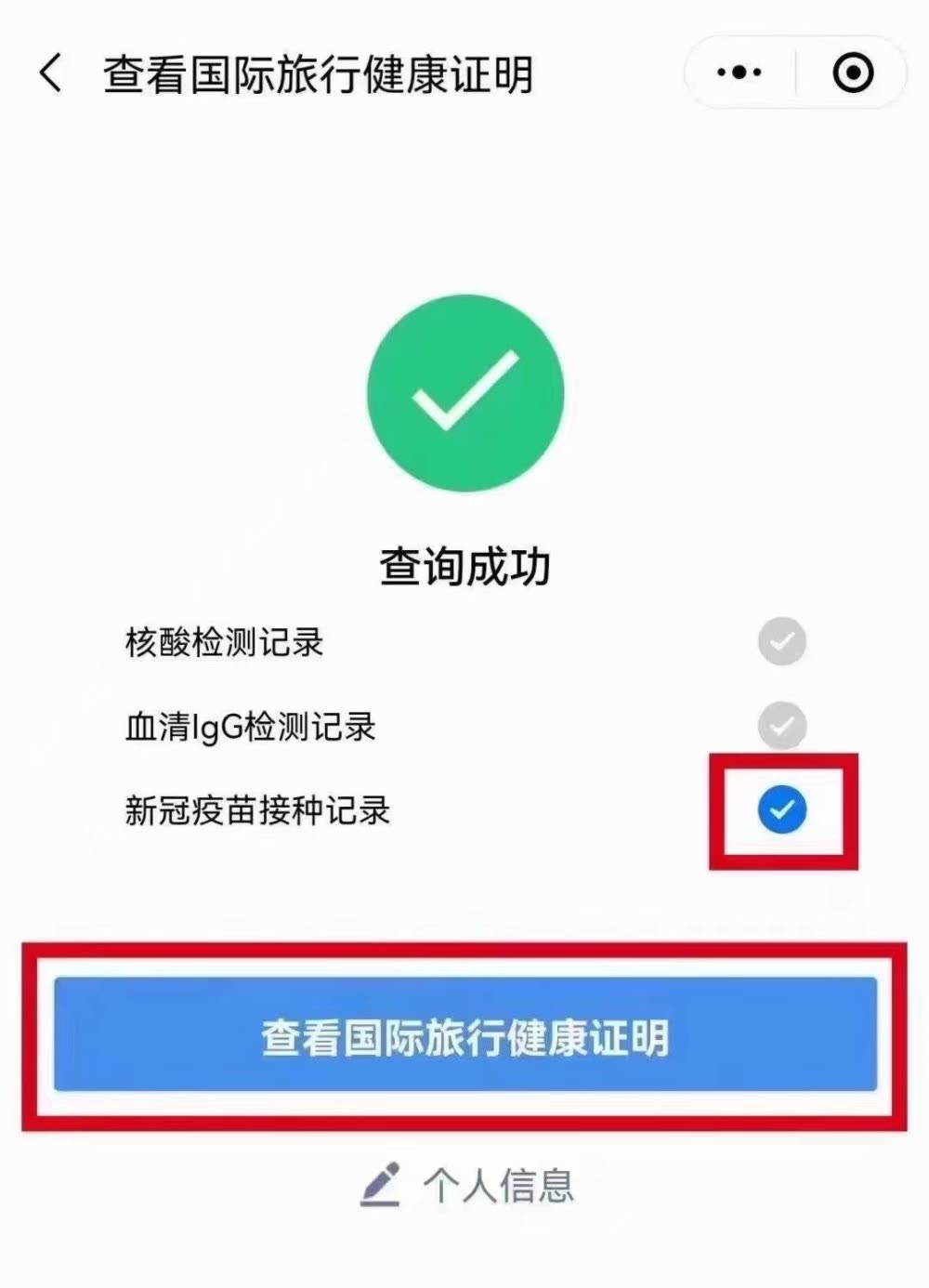 第四步:认证完毕后,点击”查看我的国际旅行健康证明”,系统会自动选择新冠疫苗接种记录,再次点击“查看国际旅行健康证明”,立即出现个人疫苗接种信息。