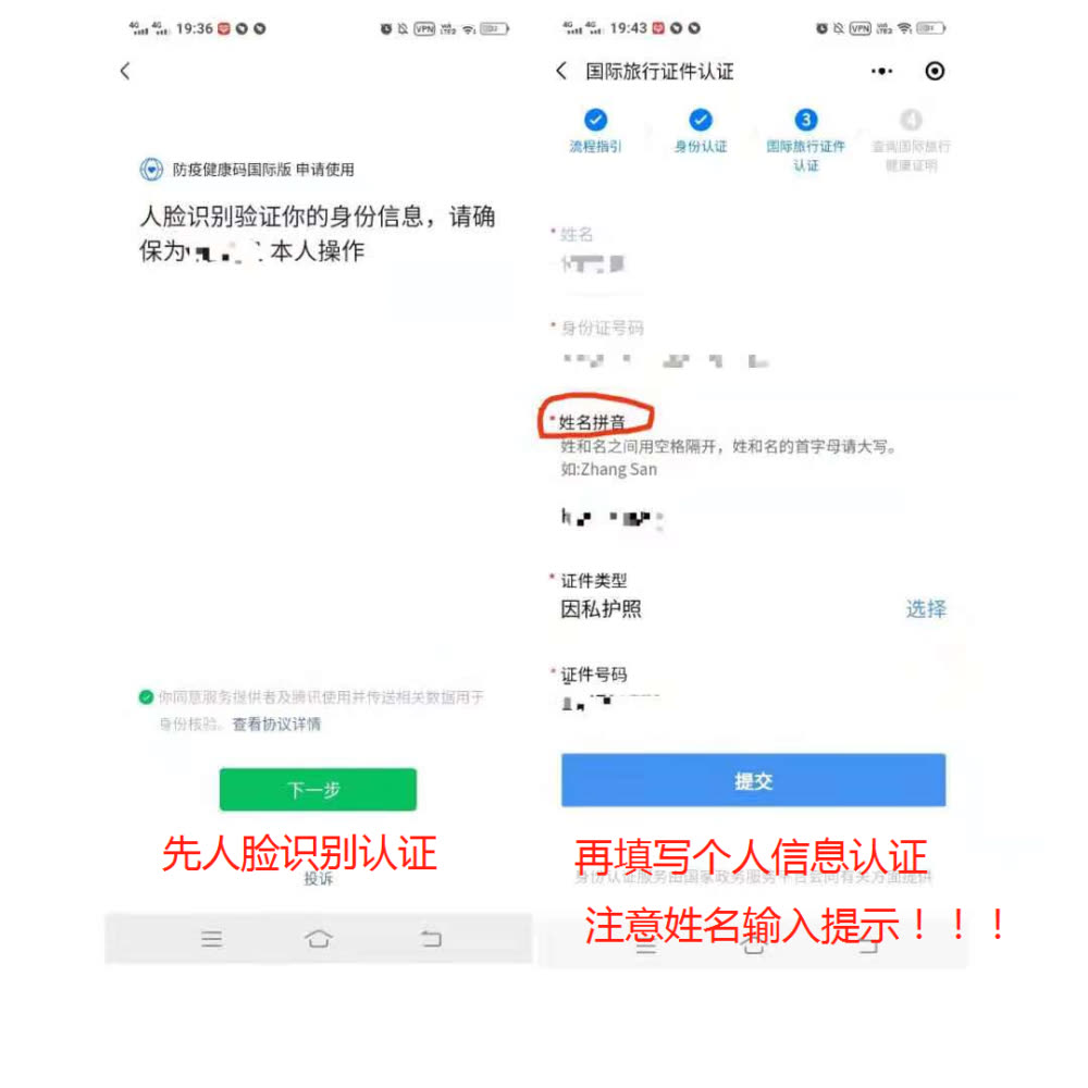 (2)通过人脸识别操作后之后,出现查看国际旅行健康健康证明页面,点击补充个人信息,输入姓名拼音、勾选证件类型、填写护照号提交,即完成认证。