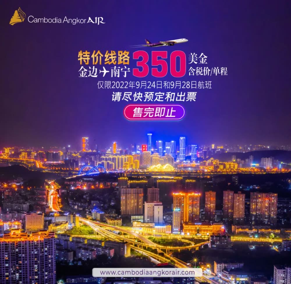 【柬埔寨头条综合报道】9月19日下午,柬埔寨国家航空发布金边至南宁回国机票促销消息,原文具体如下: