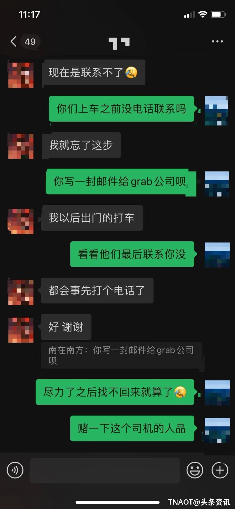 随后,小编和他私聊并建议他做最后的尝试,给Grab公司发一封邮件,提供详细的订单及行程信息,以便平台和司机取得联系。尽管群里有人说邮件一般都是两三天才回复,但是应该尽力做最后的尝试,如果到时候没找回来也不必遗憾,因为尽力了。