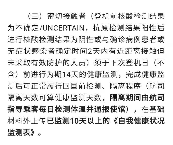 据中国驻使馆6月1日发布《关于近期调增自柬赴华直航航班和为自柬乘机赴华人员审发蓝色健康码的通知》,密切接触者(登机前核酸检测结果为不确定/UNCERTAIN,抗原检测结果阳性后进行核酸检测结果为阴性或与确诊病例患者或无症状感染者确定时间2天内有近距离接触但未采取有效防护的人员)须于下次登机日(不含)前进行为期14天的健康监测,完成健康监测后可正常履行回国前检测、隔离程序(航司隔离天数可算健康监测天数,隔离期间由航司指导乘客每日检测体温并通报使馆),在基础材料外上传已监测10天以上的《自我健康状况监测表》。