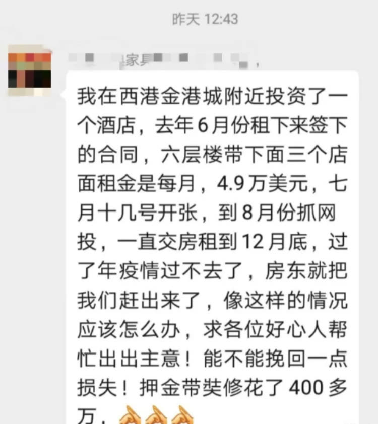 她说从1月初至今没收到房租,每个月不仅要贴地租还要给酒店交水电费,所以3月初就锁酒店门了,“我不是慈善家,我也是投资方,不可能给那些员工白住。”