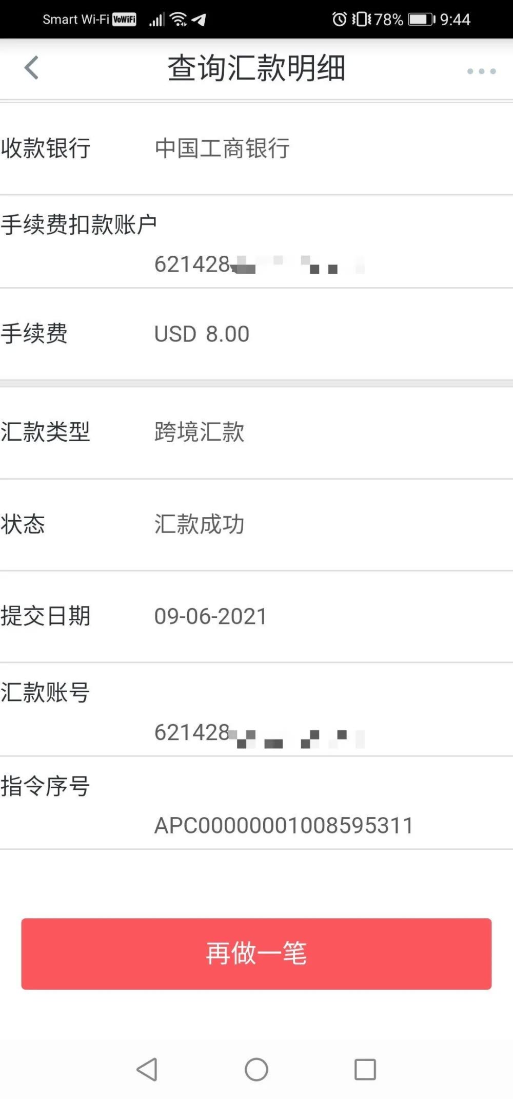 汇率都是按照当天的汇率,6月9号汇的是6.38,手续费工商银行跨境同行汇款5000美元以下是8美元,具体可以咨询银行哟!