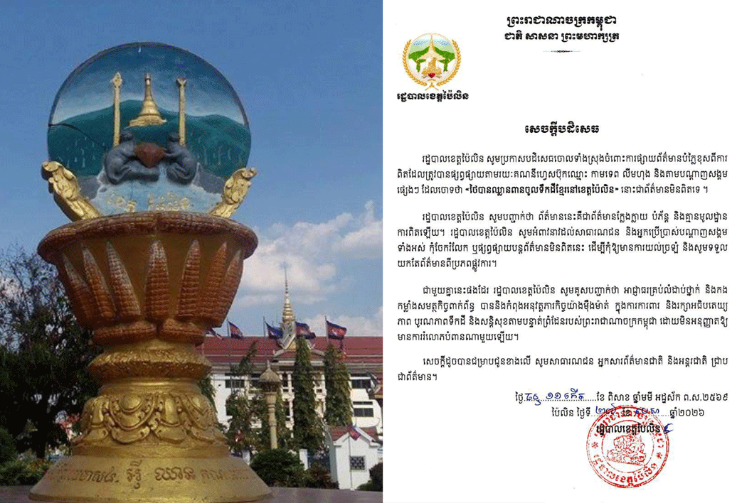 【柬埔寨头条综合报道】据柬媒消息,针对近期社交媒体上流传的“泰国入侵柬埔寨拜林省领土”等言论,拜林省政府于2026年4月27日发布通报,对此类虚假信息予以全盘否定与严厉驳斥。