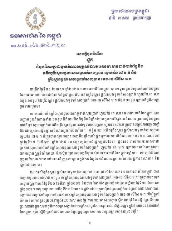 【柬埔寨头条综合报道】据柬埔寨国家银行 2026年4月24日发布的通告,柬埔寨国家银行接待了10名个人代表,他们自称与已注销的支付结算服务机构“汇旺”以及H-Pay支付服务机构。讨论结果如下: