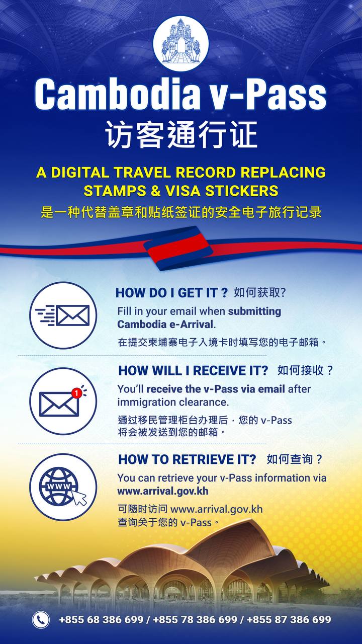 2026年4月27日1,897 阅读【柬埔寨头条综合报道】据本地媒体报道,为参与落实柬埔寨政府第七届政府关于发展数字经济社会的政策及五角战略第一阶段,移民总局继续推广试用 "v-Pass" (访客通行证) 系统,以取代所有通过三大国际机场及国际港口口岸出入境柬埔寨的外国旅客使用的传统移民印章或贴纸式二维码。
