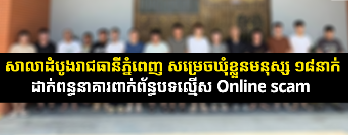 【柬埔寨头条综合报道】据柬媒消息,金边市初级法院调查法官洪卜近日签发18份拘留令,对18名涉嫌参与网络诈骗的嫌犯依法采取羁押措施。