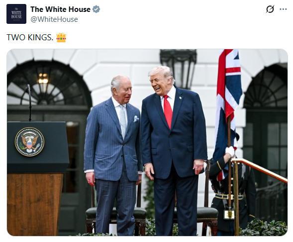 画面中,查尔斯三世和美国总统特朗普相视而笑,配文“两个国王”,简短二字暗含深意,耐人寻味。