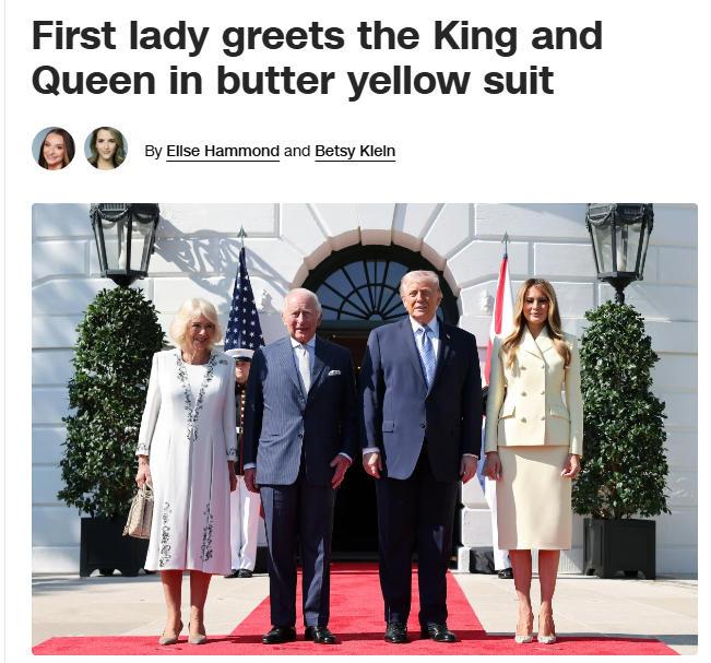 4月28日,特朗普在白宫举行仪式,正式欢迎到访的查尔斯夫妇。现场鸣21响礼炮,一支由200人组成的军乐队和500名美国武装部队成员在细雨中列队行进。特朗普开玩笑说,这天气很“英国”。
