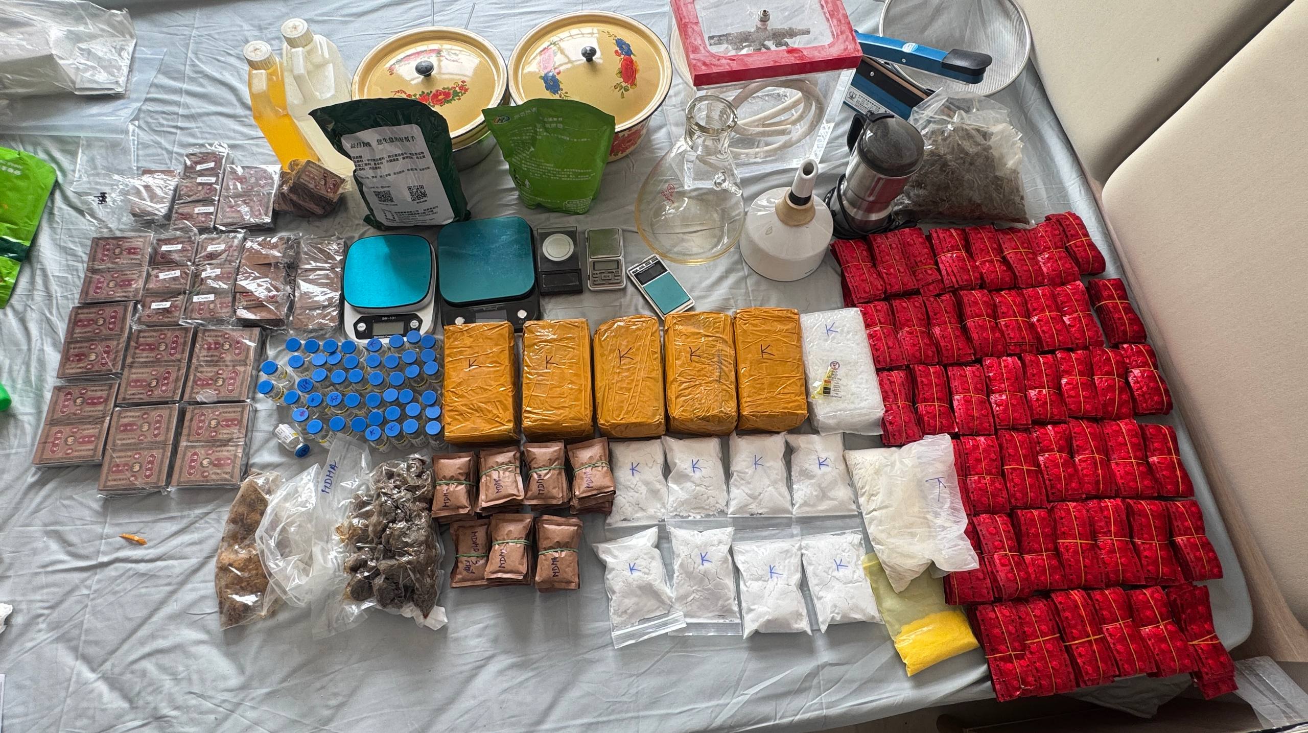 缴获的物证包括14台笔记本电脑、6部手机以及约10公斤多种毒品。